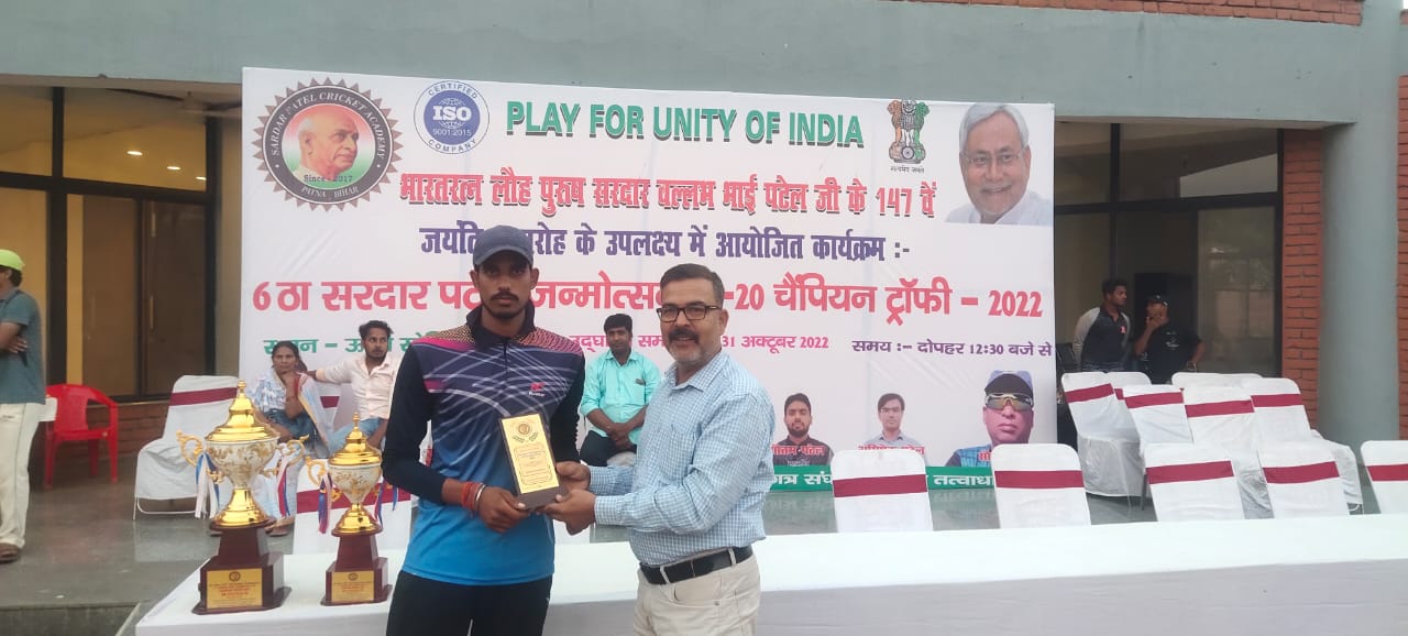 एकमात्र गेंदबाज शुभम कुमार को सफलता हाथ लगी। अंडर-17 आयु वर्ग में उत्कृष्ट प्रदर्शन करने वाले खिलाड़ी सर्वेश को प्लेयर ऑफ द मैच के अवार्ड से पटना के जाने-माने समाजसेवी बिट्टू सिंह ने सम्मानित कर हौसला बढ़ाया। जबकि अंडर- 25 आयु वर्ग में उत्कृष्ट प्रदर्शन करने वाले गेंदबाज रोशन कुमार को प्लेयर ऑफ द मैच के अवार्ड से बिहार क्रिकेट के स्तंभ धर्मवीर पटवर्धन ने सम्मानित कर हौसला बढ़ाया।