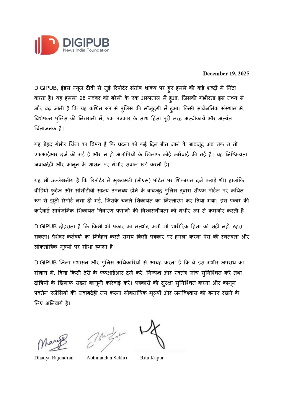 संस्था ने इस बात पर भी गहरी चिंता जताई कि घटना के कई दिन बीत जाने के बावजूद अब तक न तो एफआईआर दर्ज की गई और न ही आरोपियों के खिलाफ कोई ठोस कार्रवाई हुई है। DIGIPUB के अनुसार यह स्थिति कानून के शासन और पुलिस की जवाबदेही पर गंभीर सवाल खड़े करती है।