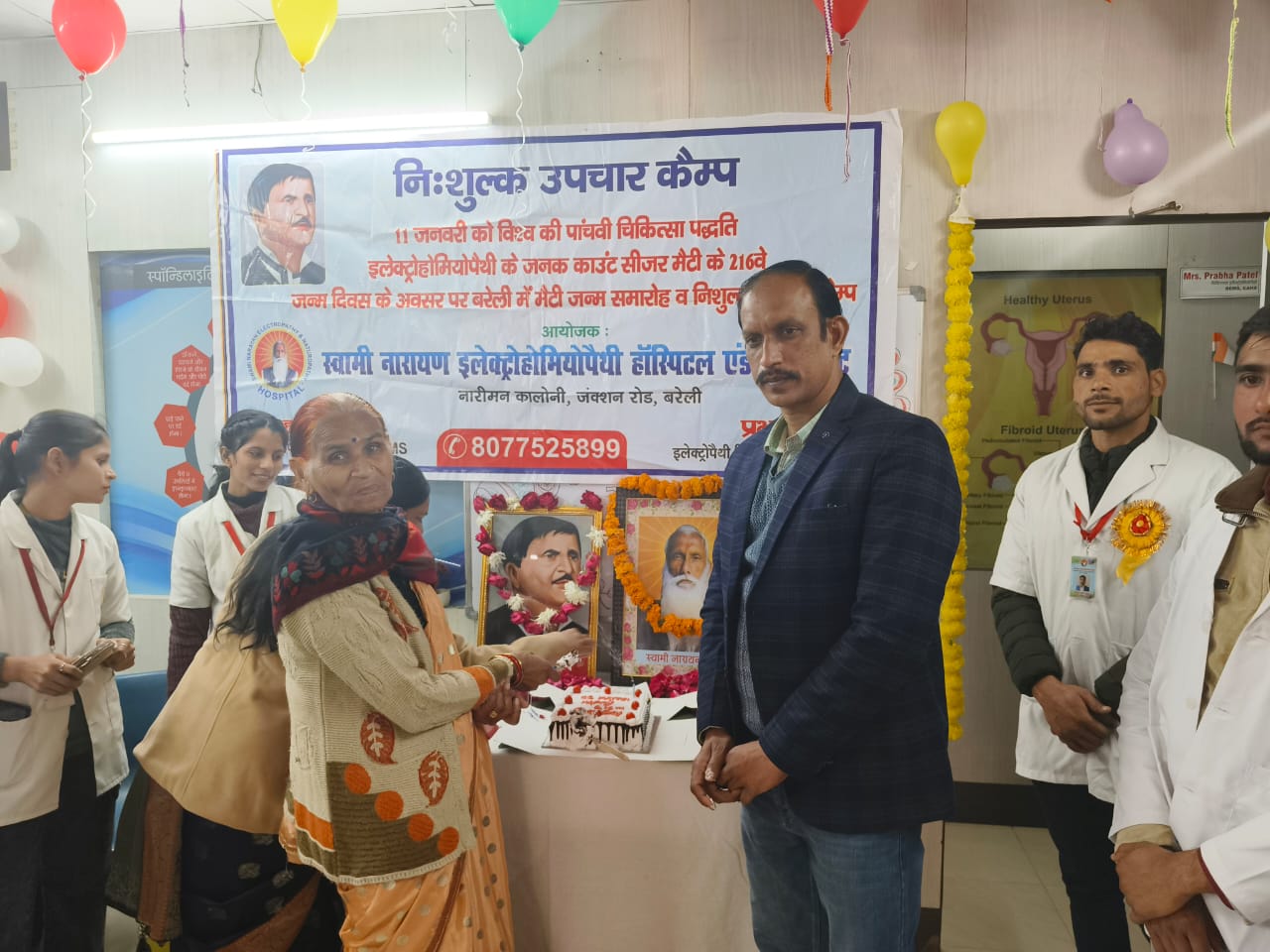 यह कैंप इलेक्ट्रोहोमियोपैथी के जनक डॉ काउंट सीजर मैटी के 216 वें जन्म दिवस पर आयोजित हुआ, इसके साथ जयंती समारोह भी बहुत ही धूमधाम से मनाया गया। इस अवसर पर विश्व की पांचवी हर्बल चिकित्सा पद्धति के जनक डॉ मैटी जी के चित्र पर पुष्प अर्पित कर कार्यक्रम की शुरुआत की गई। डॉ. हरीश पटेल की मां रिटायर्ड अध्यापिका श्रीमती सुदामा देवी ने केक काट कर कार्यक्रम का शुभारंभ किया। डॉ मैटी के जन्मदिवस पर सभी उपस्थित लोगों ने एक दूसरे को केक खिला कर महामानव डॉ मैटी का जन्म दिवस मनाया। इस दौरान उपस्थित डॉ. हरीश पटेल एवं डॉ प्रभा पटेल के साथ डॉ प्रीति मौर्य (रुद्रपुर), डॉ कोमल भारती एवं BEMS द्वितीय वर्ष की की छात्रा अनुष्का गंगवार, निदा जहां, शिवानी गंगवार, सतेंद्र कुमार, विजय गंगवार व शिवम उपस्थित रहे। (Free treatment camp organized)