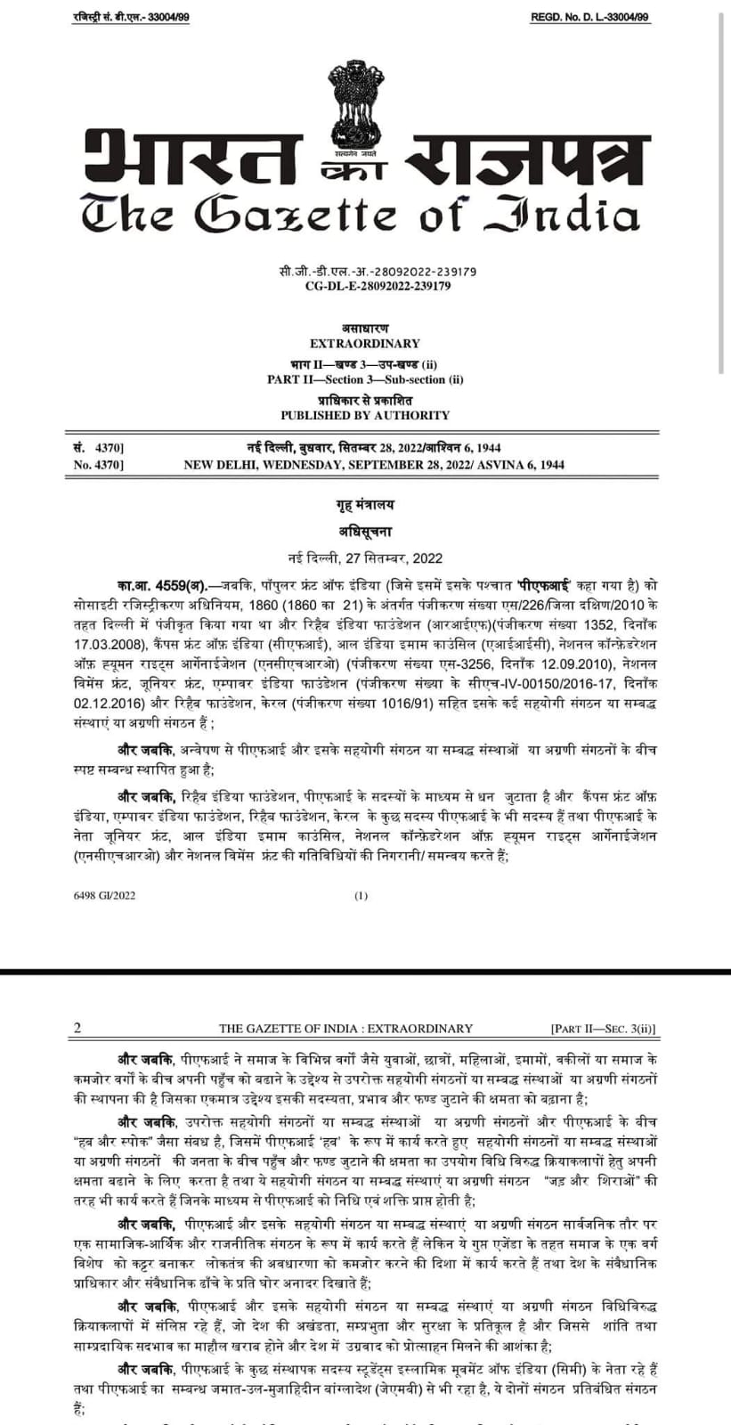 “गैरकानूनी गतिविधि रोकथाम अधिनियम, 1967 की धारा 3 की उप-धारा (1) द्वारा प्रदत्त शक्तियों का प्रयोग करते हुए, केंद्र सरकार ने पॉपुलर फ्रंट ऑफ इंडिया को इसका सहयोगी घोषित किया। रिहैब इंडिया फाउंडेशन, कैंपस फ्रंट ऑफ इंडिया, ऑल इंडिया इमाम काउंसिल, नेशनल कॉन्फेडरेशन ऑफ ह्यूमन राइट्स ऑर्गनाइजेशन, नेशनल वुमन फ्रंट, जूनियर फ्रंट, एम्पावर इंडिया फाउंडेशन और रिहैब फाउंडेशन, केरल सहित मोर्चों को एक ‘गैरकानूनी एसोसिएशन’ के रूप में जाना जाता है।