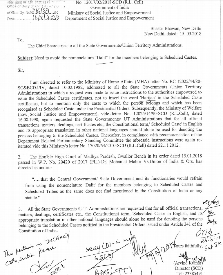 भारत के राष्ट्रपति ने भारत सरकार के सामाजिक न्याय व अधिकारिता मंत्रालय के पत्र दिनांक 22-11-12 व क्रमांक 17020/64/2010 / SCD (RL CELL) के मार्फत सभी राज्यों व केंद्र शासित प्रदेशों के मुख्य सचिवों को सर्कुलर जारी कर जातिसूचक शब्द के सरकारी काम काज में इस्तेमाल पर तुरंत रोक लगाने के आदेश दिए हुए हैं। अब इस मामले में सुप्रीम कोर्ट की मुहर लग चुकी है।