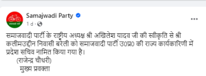 समाजवादी पार्टी के प्रवक्ता राजेंद्र चौधरी ने भी सपा के ऑफिसियल फेसबुक पेज पर पोस्ट डालकर इसकी सूचना दी।