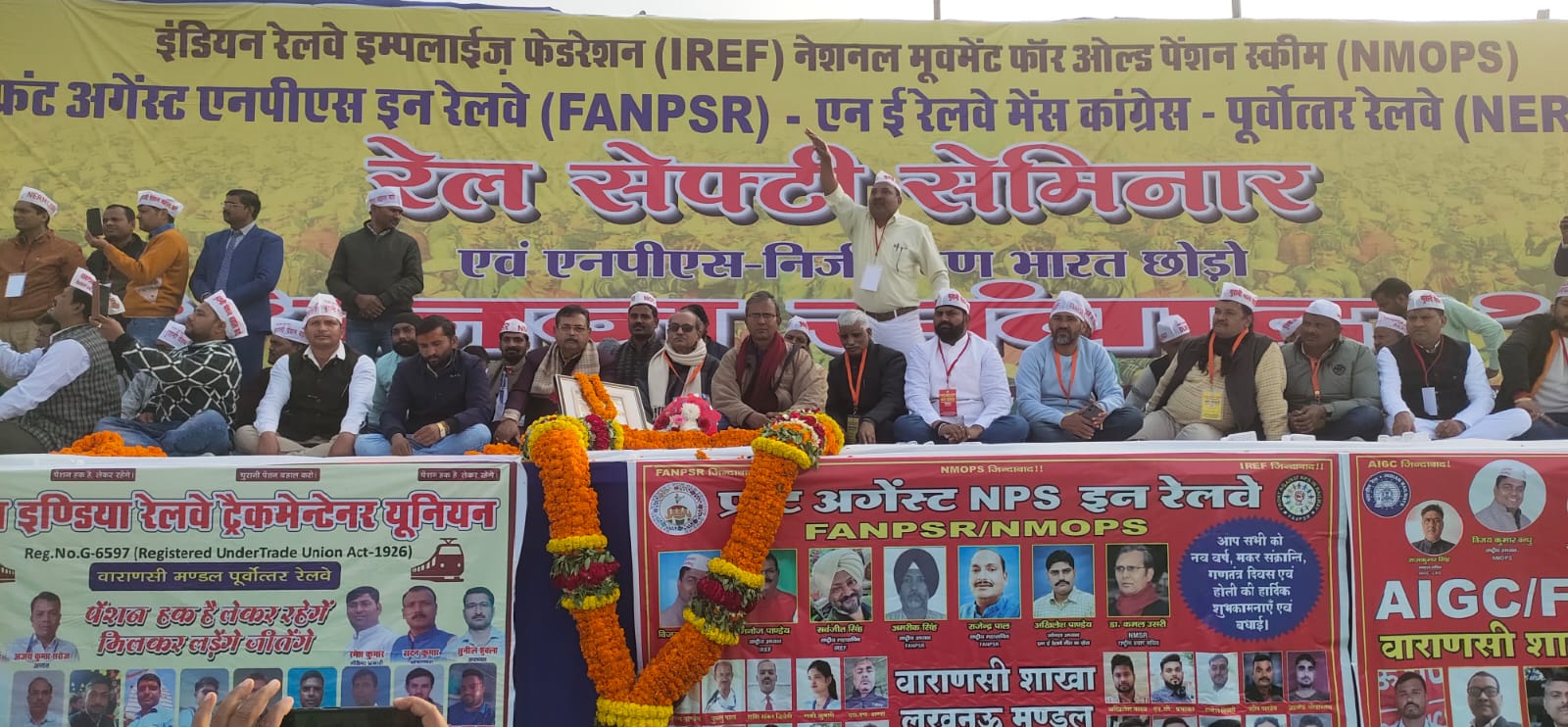 बनारस। प्रधानमंत्री के लोकसभा क्षेत्र वाराणसी में पूर्वोत्तर रेलवे कोचिंग डीपो के सामने, रेलवे मैदान में “फ्रंट अगेंस्ट एनपीएस इन रेलवे” एलायंस “नेशनल मूवमेंट फ़ॉर ओल्ड पेंशन स्कीम”, व “एनई रेलवे मेंस कॉग्रेस” सम्बद्ध “इंडियन रेलवे इम्प्लाइज फेडरेशन” व “ऐक्टू” के तत्वावधान में एनपीएस निजीकरण भारत छोड़ो जन संवाद हजारों पेंशन विहीन रेलवे कर्मचारियों की भागीदारी के साथ सम्पन्न हुआ। जन संवाद में रेलवे के कई जोन में ऐक्टू से सम्बद्ध रेलवे में कार्यरत विभिन्न यूनियन व कटेरिगकल एसोसिएशन के साथ ही छात्र, किसान, संगठित व असंगठित क्षेत्र के मजदूर, बेरोजगार नौजवान, महिला, बुद्धिजीवी व सामाजिक कार्यकर्ताओं ने भागीदारी किया।