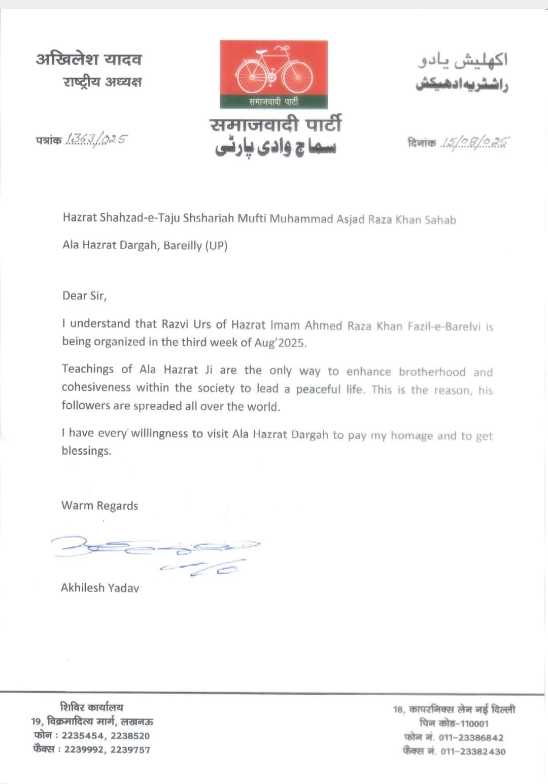 बरेली: समाजवादी पार्टी के राष्ट्रीय अध्यक्ष अखिलेश यादव ने दरगाह शरीफ पर चादर पेश करने का संदेश भेजा , उन्होंने अपने संदेश में कहा कि “आला हज़रत ने पूरी जिंदगी इंसानियत, अमन और भाईचारे का पैग़ाम दिया। उनकी शिक्षा आज भी हमें सच्चाई, मोहब्बत और एकता की राह पर चलने की प्रेरणा देती है। हम सबका फर्ज़ है कि उनके बताए रास्ते पर चलकर गंगा-जमुनी तहज़ीब को और मजबूत करें।”